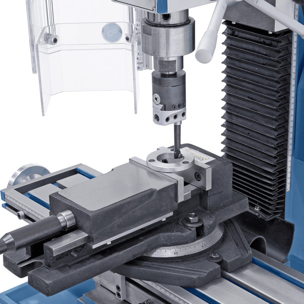 La tavola a croce da 700 x 180 mm con corse di 490 x 150 mm e la testa inclinabile ±90° permettono di eseguire lavorazioni angolari e smussi in modo semplice e preciso. Il motore a corrente continua fornisce coppia ottimale anche a bassi regimi, mentre le guide a coda di rondine su X, Y e Z, regolabili con lardoni, garantiscono stabilità.