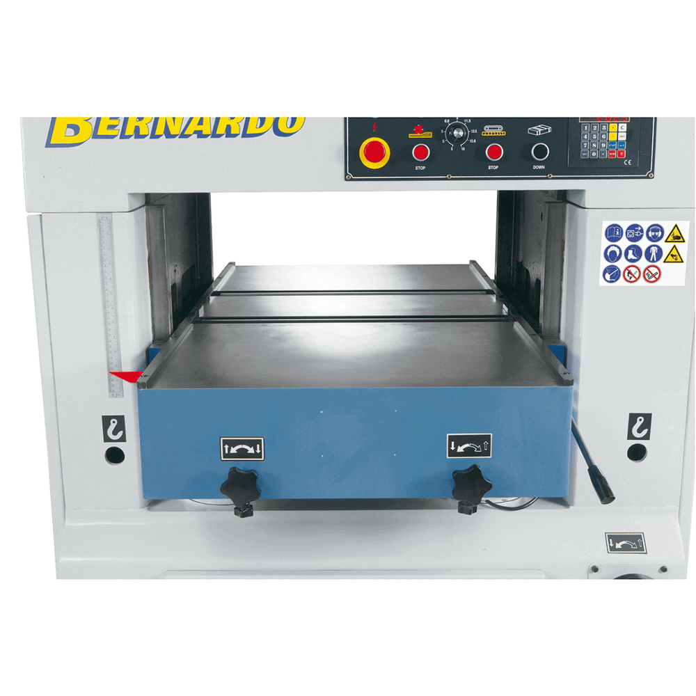 La pialla a spessore Bernardo TP 630 D è una macchina industriale di altissima precisione, pensata per falegnamerie, carpenterie e laboratori professionali che richiedono prestazioni elevate e finiture perfette. Con una larghezza di lavoro di 630 mm e un’altezza massima di 300 mm, è ideale per la piallatura di tavole, travi e pannelli di grandi dimensioni. Il tavolo in ghisa rettificata garantisce stabilità e scorrevolezza, mentre la regolazione motorizzata dell’altezza con display digitale a 0,1 mm consente un controllo estremamente preciso dello spessore. L’avanzamento a velocità variabile da 5 a 18 m/min permette di adattarsi al tipo di legno, assicurando risultati perfetti. Dotata di albero a 4 coltelli HSS, rulli d’ingresso segmentati e doppia uscita aspirazione Ø 150 mm, la TP 630 D rappresenta la soluzione definitiva per una piallatura professionale potente, silenziosa e sicura.