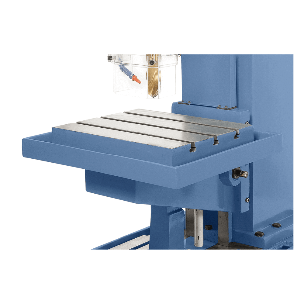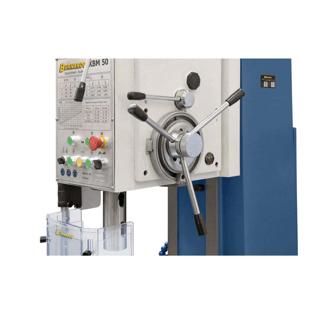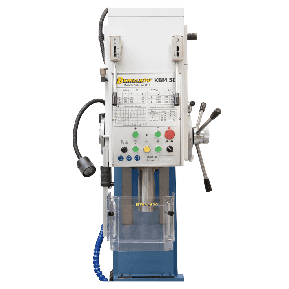 Il Bernardo Trapano a colonna fissa KBM 50 è una macchina industriale progettata per garantire massima precisione, forza e durata nelle lavorazioni più impegnative. Con una capacità di foratura fino a 50 mm in acciaio e filettatura fino a M42, rappresenta la soluzione ideale per officine e produzioni meccaniche. La struttura in ghisa grigia assicura stabilità, mentre il motore da 4,0 kW eroga una coppia di 350 Nm con forza di avanzamento fino a 16.000 N. L’avanzamento automatico del mandrino, il dispositivo di filettatura con inversione automatica e la tavola in ghisa con cave a T offrono massima versatilità. Completo di dispositivo refrigerante, lampada LED, protezione regolabile e accessori di serie, il KBM 50 combina tecnologia avanzata e robustezza per utilizzi intensivi e di lunga durata.
