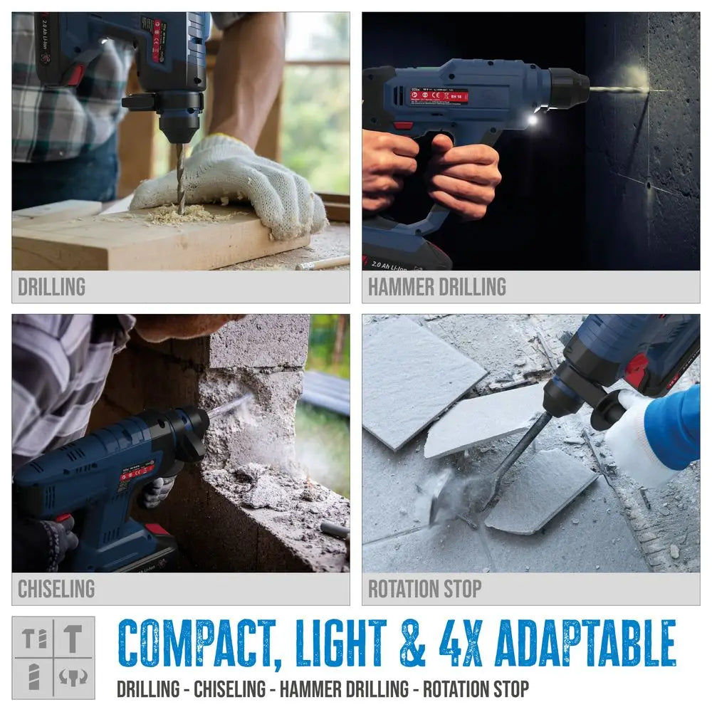 • 4 funzioni integrate: foratura, percussione, scalpellatura e rotazione con stop