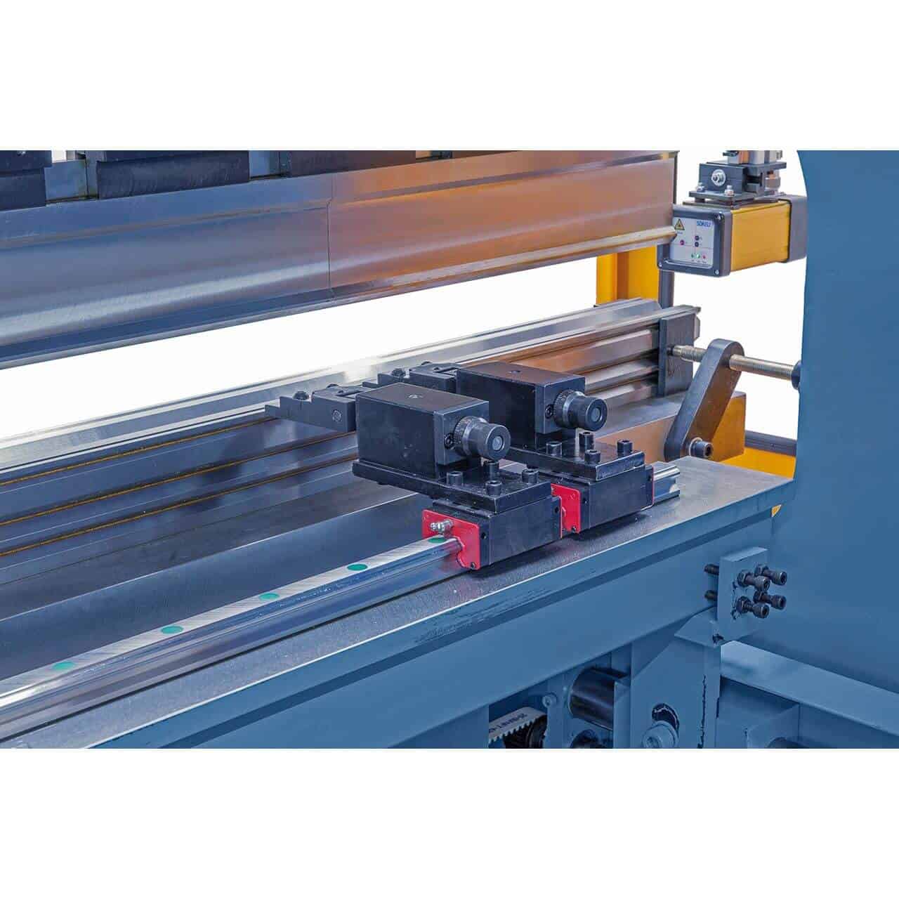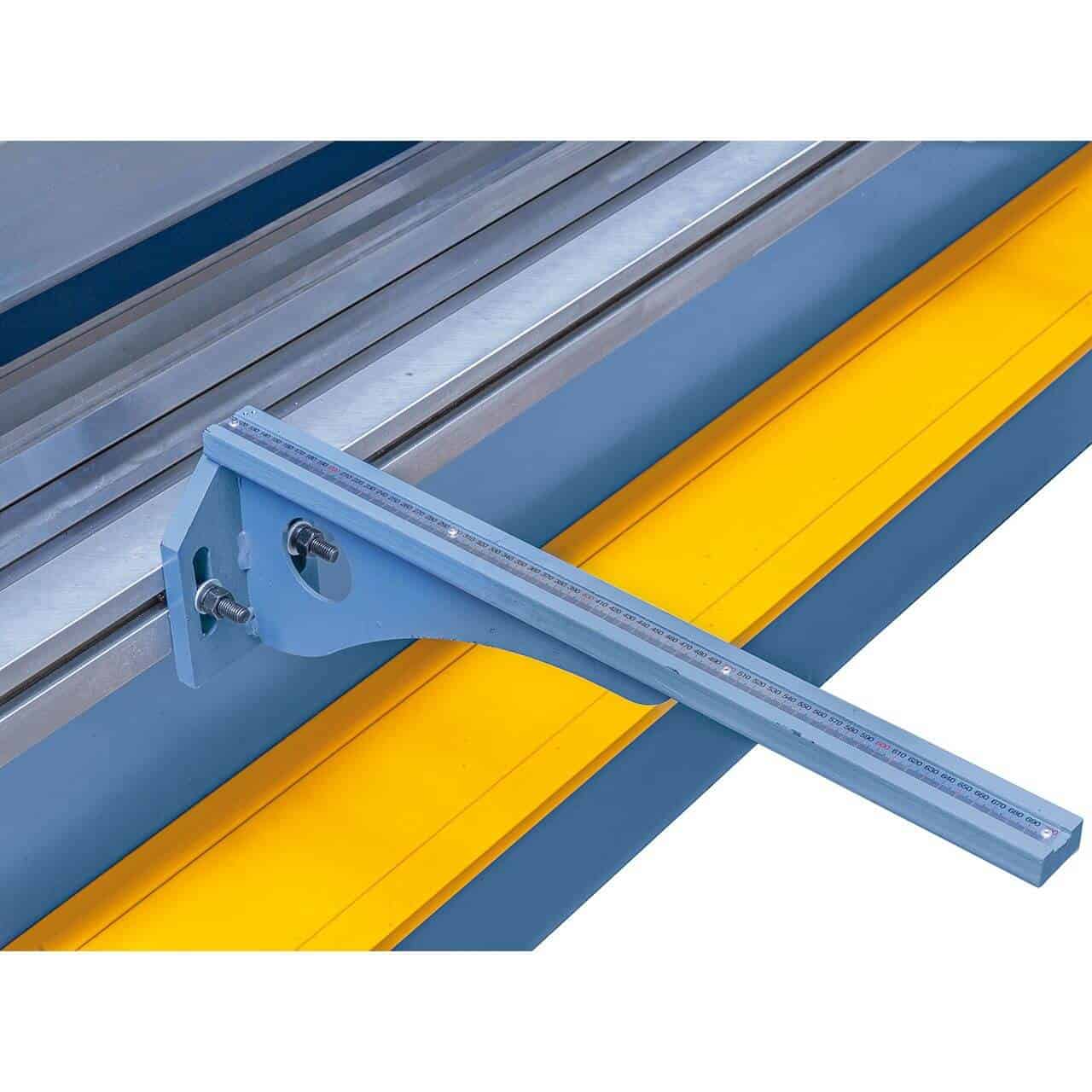 Sì, regolabile da 0 a 600 mm con vite a ricircolo di sfere e dita di battuta regolabili in altezza. Garantisce precisione nelle lavorazioni di serie.
