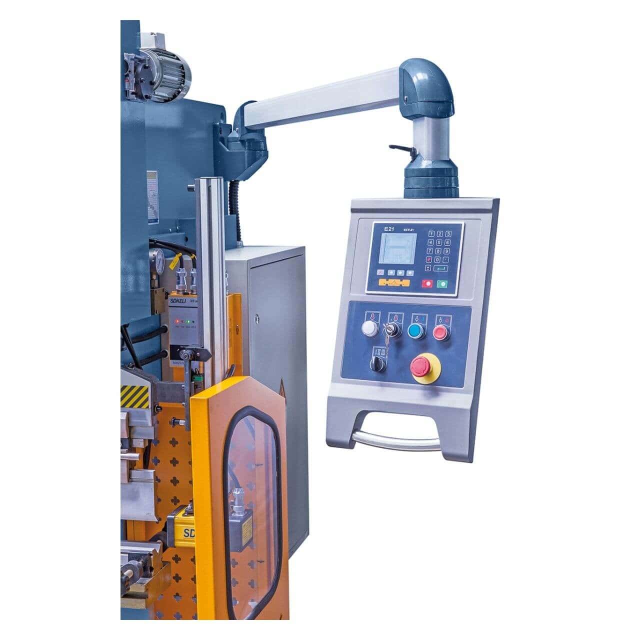L’operatore imposta i parametri tramite CNC E21S, posiziona la lamiera sul supporto frontale e aziona il pedale con arresto di emergenza. La macchina applica fino a 100 t di pressione per piegature precise e sicure.