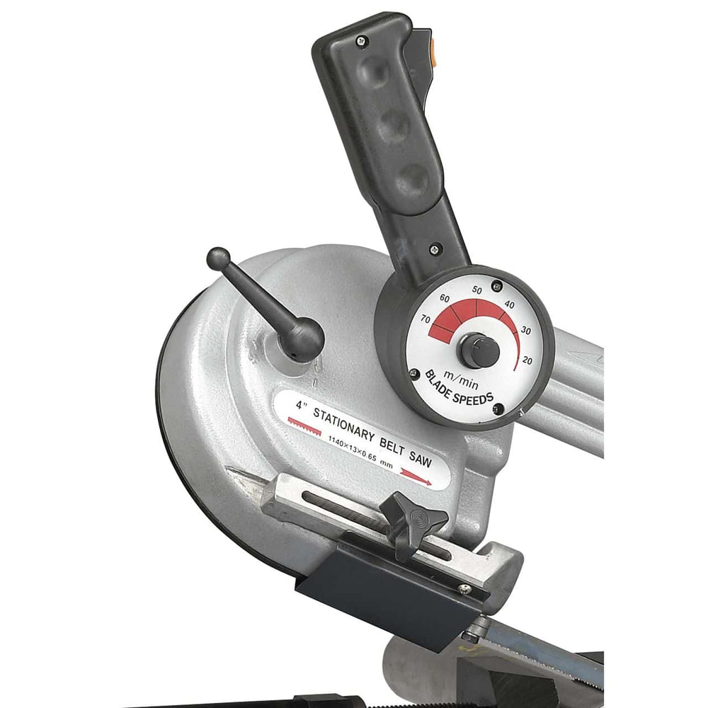 The EBS 100 B small metal band saw is designed to offer reliable performance in a compact format. Its compact size makes it ideal for work environments with limited space or for operators requiring an easily transportable machine. A distinctive feature of this saw is the ability to make miter cuts on one side. This option allows operators to make angled cuts with precision and ease, opening up a range of design and creative possibilities. The belt speed is electronically adjustable, meaning operators can adjust the cutting speed to suit the material they're working on. This versatility allows the machine to handle a variety of materials, including ferrous and non-ferrous metals, plastics, wood, and other common materials used in fabrication and carpentry.