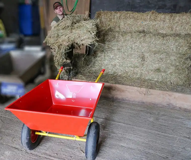 The sturdy manure cart can withstand a bit of everything, thanks to its painted steel tub.