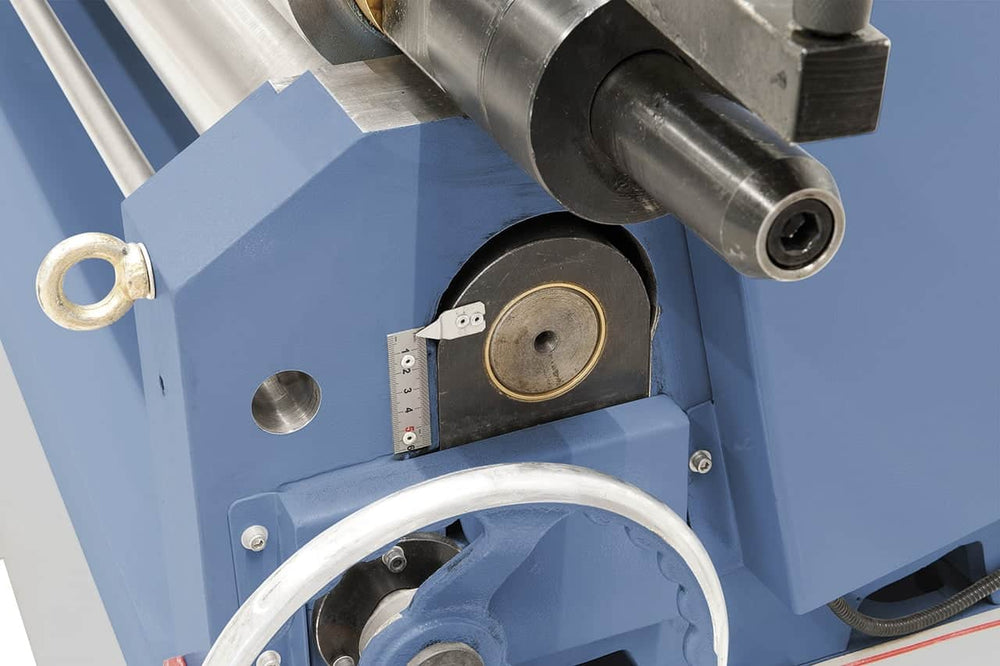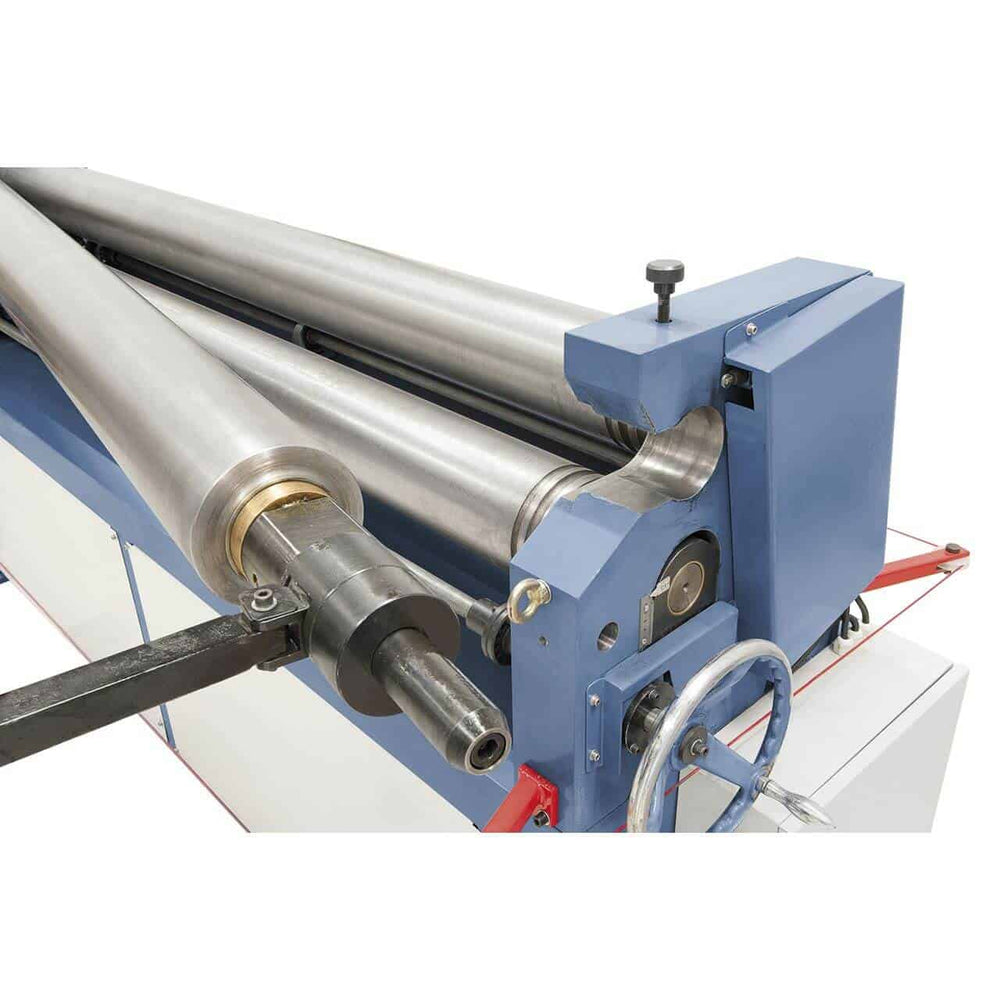 This 3-roller plate bending machine is designed for professional bending of steel, stainless steel, and aluminum sheets, offering high precision thanks to its extremely robust sheet steel construction. The swinging upper roller allows for easy removal of the workpiece, while the lower roller is manually adjustable via a handwheel for precise setting of the bending diameter.