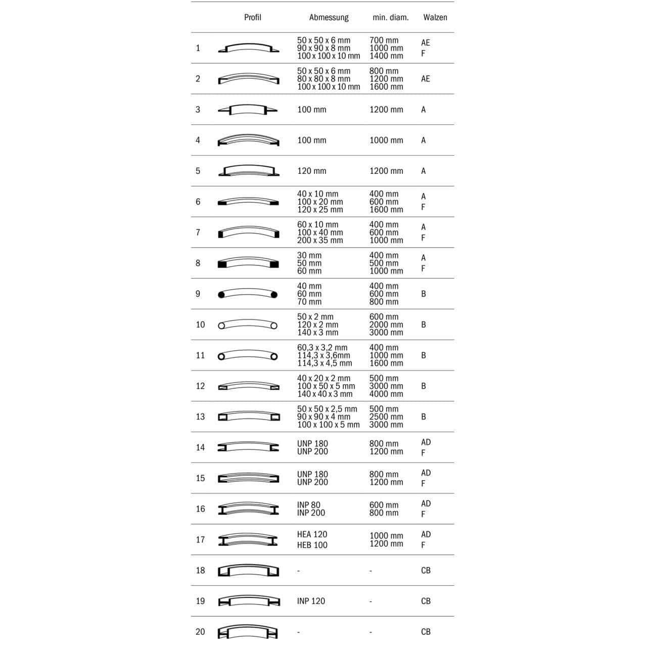 I rulli hanno diametro di 315 mm e sono montati su alberi da 100 mm, ideali per curvatura di grandi profili.