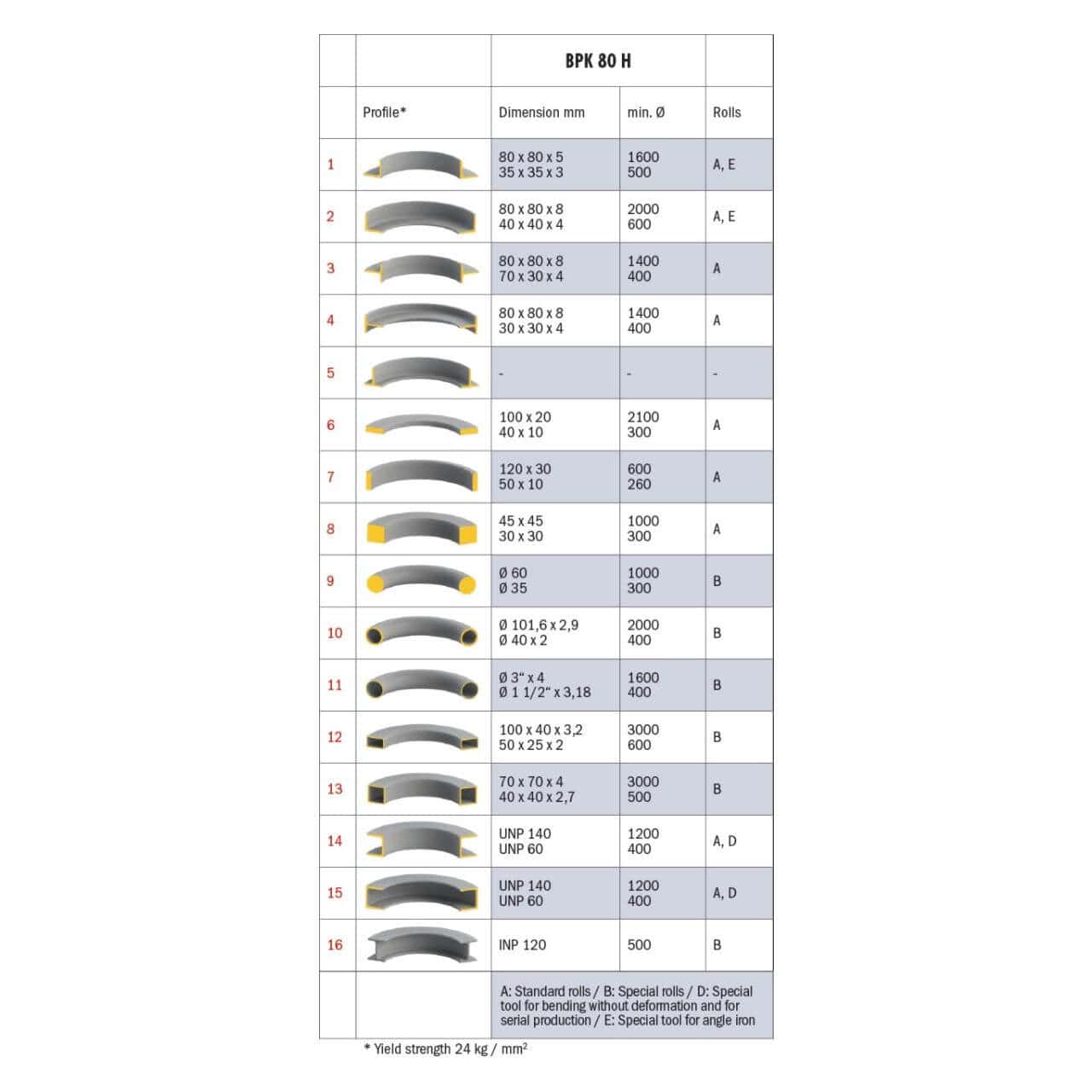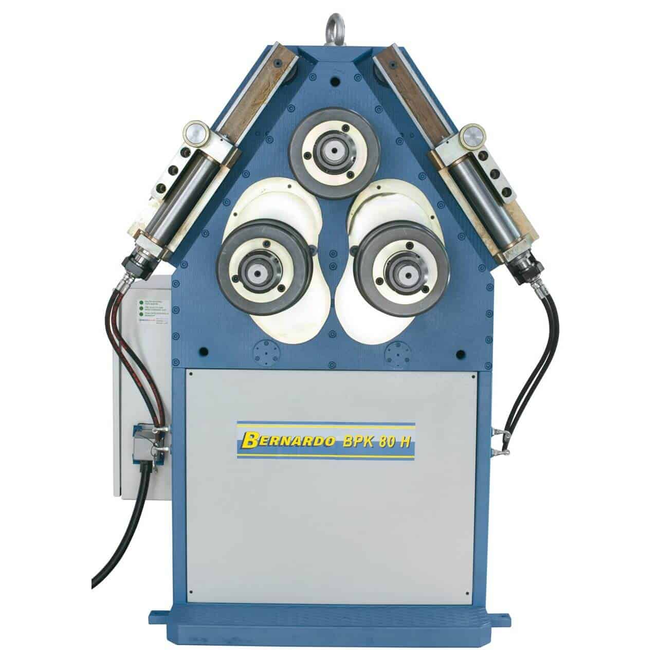 La confezione comprende la curvatrice BPK 80 H, set di rulli standard, rulli raddrizzatori laterali, pedale di emergenza, avvicinamento idraulico e indicatore digitale per i rulli inferiori.