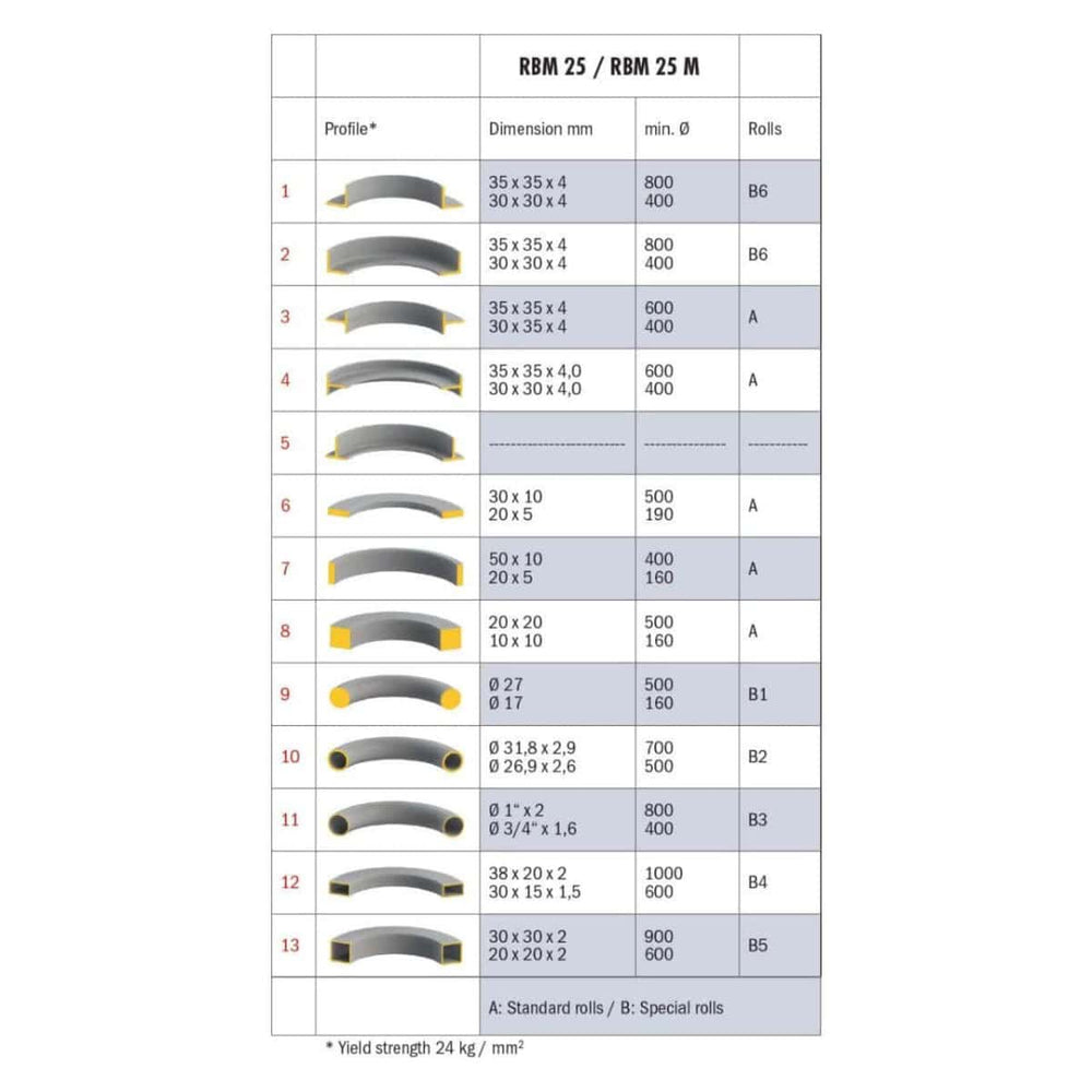 The RBM 25 tube bender is a compact and robust machine, ideal for bending tubes and profiles made of steel, aluminum, brass, and other materials. Equipped with standard rollers and lateral straighteners, it offers a practical and versatile solution for precise and repeatable work.