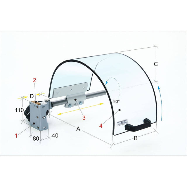 The shield's shape makes it ideal for positioning near the machine's head. It features a monolithic "opaque" composite shield and is available in various sizes.