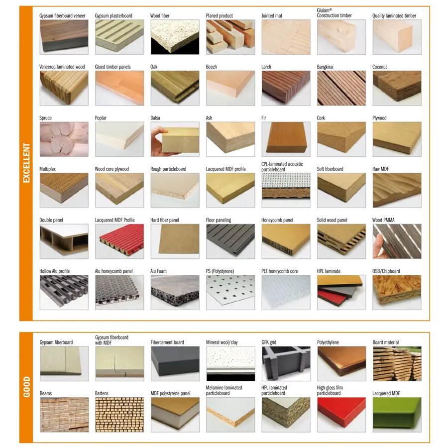 Wood materials, plastic, MDF and OSB, building materials and composites.