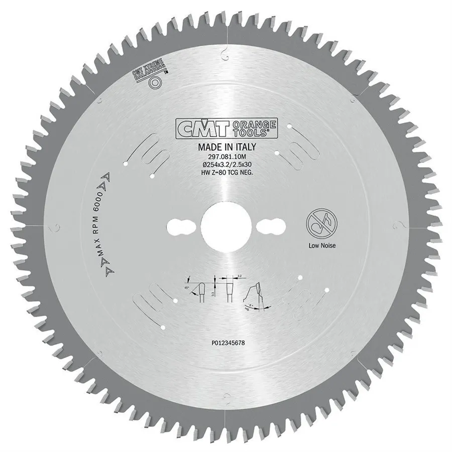Saw blade with negative cutting angle. Designed for high performance, high-quality cuts, and long-lasting edge. The CMT blade for non-ferrous metals and plastics is ideal for cutting with radial and circular saws.