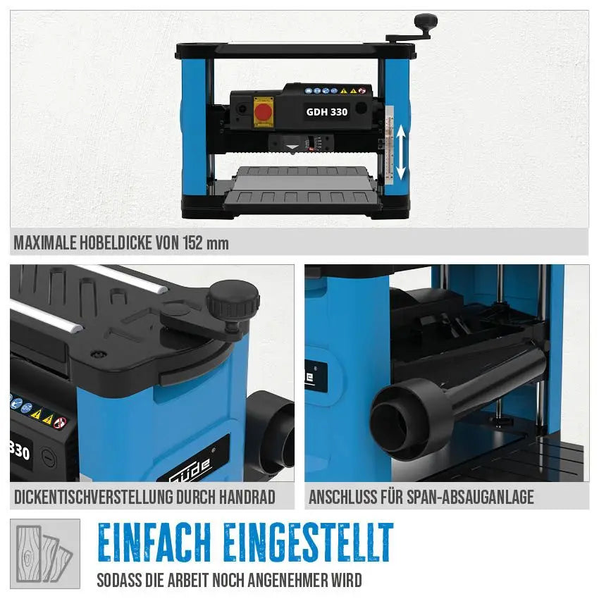 La pialla a spessore Güde GDH 330 è progettata per garantire precisione, stabilità e praticità in ogni lavorazione del legno. Grazie al piano di alimentazione ribaltabile e alla regolazione continua dello spessore centrale, permette di ottenere superfici perfettamente planari con un’ampiezza massima di piallatura di 330 mm. Il robusto sistema di guida a 4 colonne assicura un avanzamento stabile e uniforme, mentre il motore da 1500 W e le 2 lame di taglio garantiscono prestazioni elevate e risultati puliti.