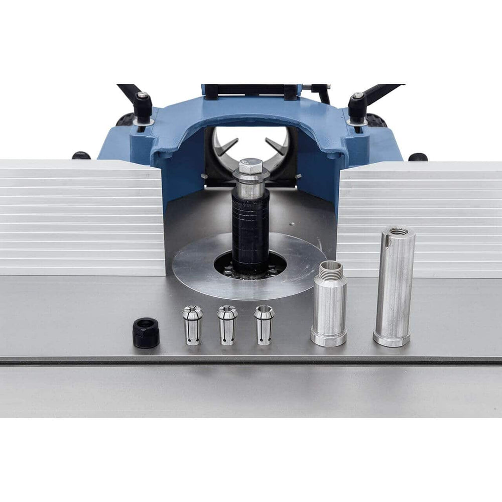 You can use tools with diameters up to 200 mm for external machining and up to 95 mm for under-table machining. Collets for 6, 8, and 12 mm end mills are included.