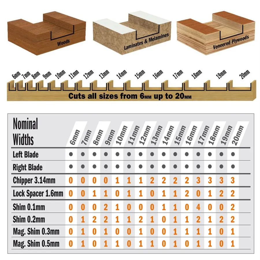 Combinando le lame principali, i chippers, i distanziatori e gli spessori inclusi nel set è possibile ottenere larghezze di taglio da 6,2 mm fino a 20 mm, con regolazioni micrometriche.