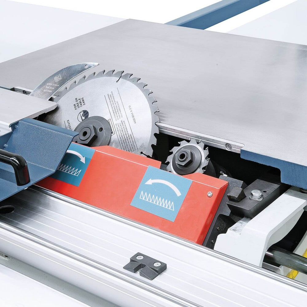 Yes, the machine is equipped with a scoring unit with an independent motor that prevents chipping even on laminated or veneered panels.