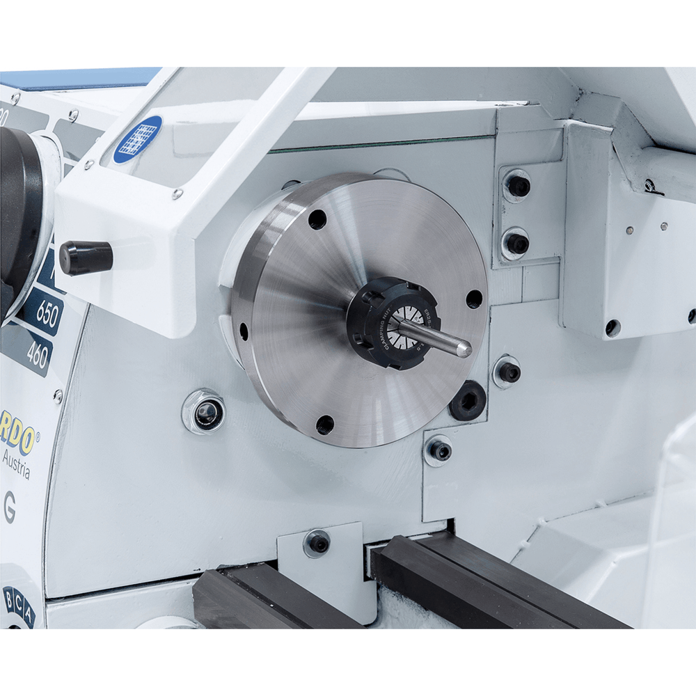 The Profi 650 G lathe is equipped as standard with a lead and draw spindle for thread cutting or automatic longitudinal and front feed. The 12-speed gearbox allows for quick speed adjustment without the need to replace the V-belts. Thanks to its compact design and high dead weight, this machine runs very smoothly and ensures precise work.
