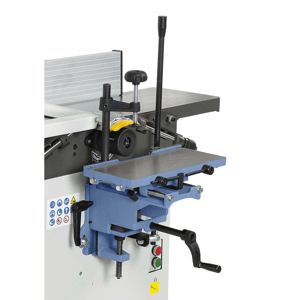 The CWM 250 R is a compact and robust combination machine, designed for craftsmen and hobbyists who need versatility in small spaces. This all-in-one solution allows you to perform planing, thicknessing, cutting, routing, and drilling operations with precision and ease. The integrated roller table, cast iron frame, and provision for an optional mortiser make it a reliable choice for any home or semi-professional workshop.