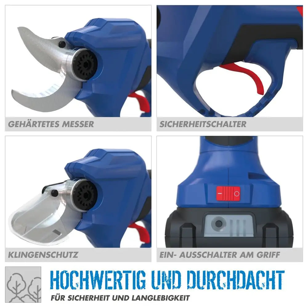 Le cesoie da potatura a batteria Guede ASC 18-201-05 K fanno parte della serie 18V E³ Easy-Energy-Exchange, che consente di utilizzare la stessa batteria su più utensili Guede. Equipaggiate con motore brushless senza manutenzione, offrono potenza costante, lunga durata e tagli sempre puliti. Le lame bypass in acciaio di alta qualità garantiscono tagli netti e precisi fino a 30 mm di spessore, favorendo la crescita sana di piante, viti e arbusti. Il design ergonomico con impugnatura soft grip, l’interruttore on/off e il dispositivo di sicurezza assicurano un utilizzo confortevole e protetto. Fornite con batteria da 2,0 Ah, caricabatteria 0,5 A e valigetta rigida, sono perfette per hobbisti e professionisti del verde.