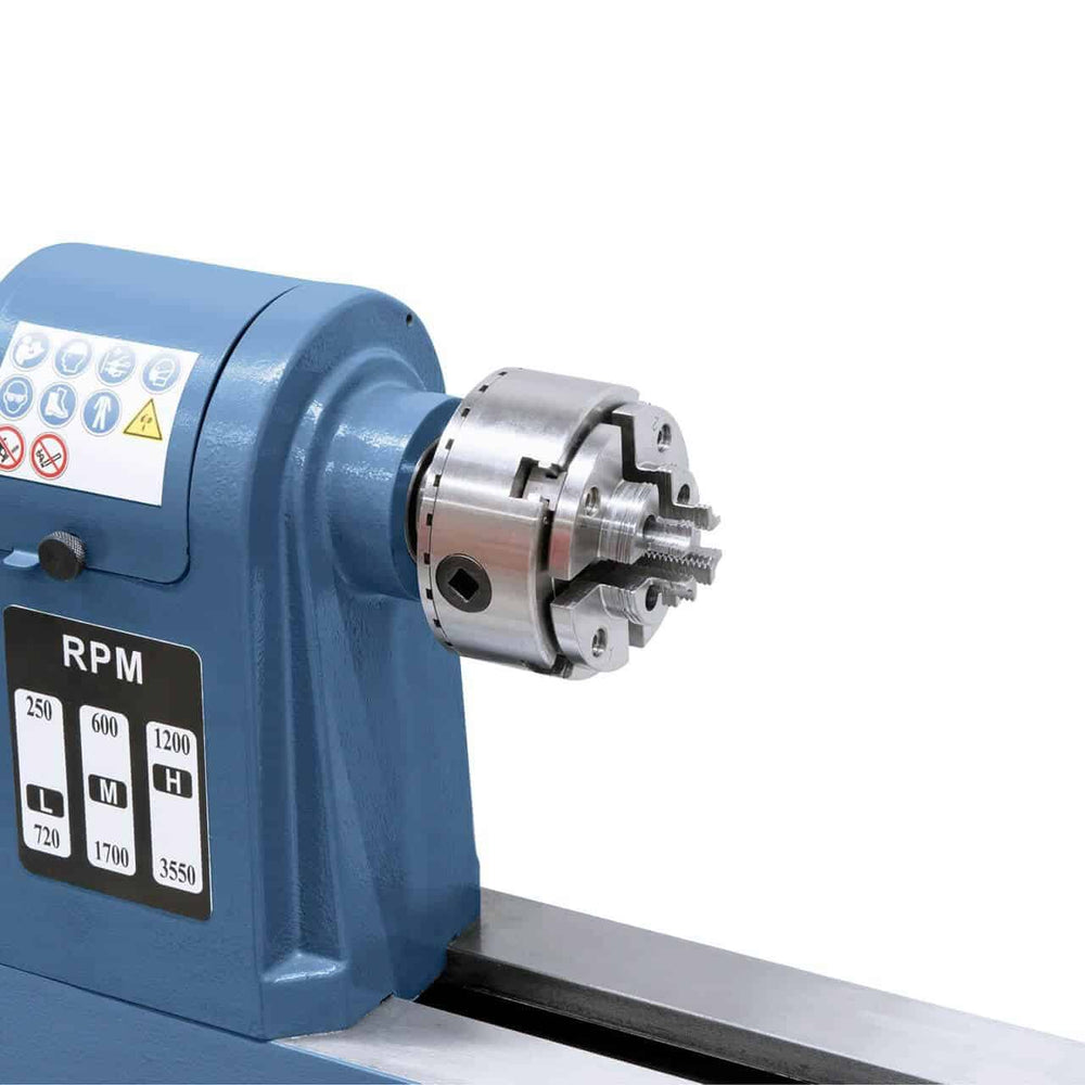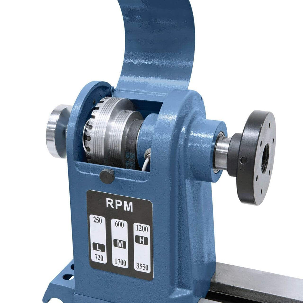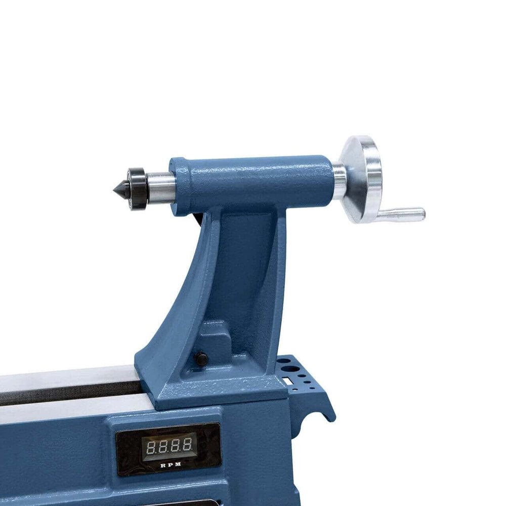 The lathe includes 200mm tool rests, 100mm faceplate, MT2 rotating tailstock, two 25mm drive centers, LED display, stepless speed control and tooling.