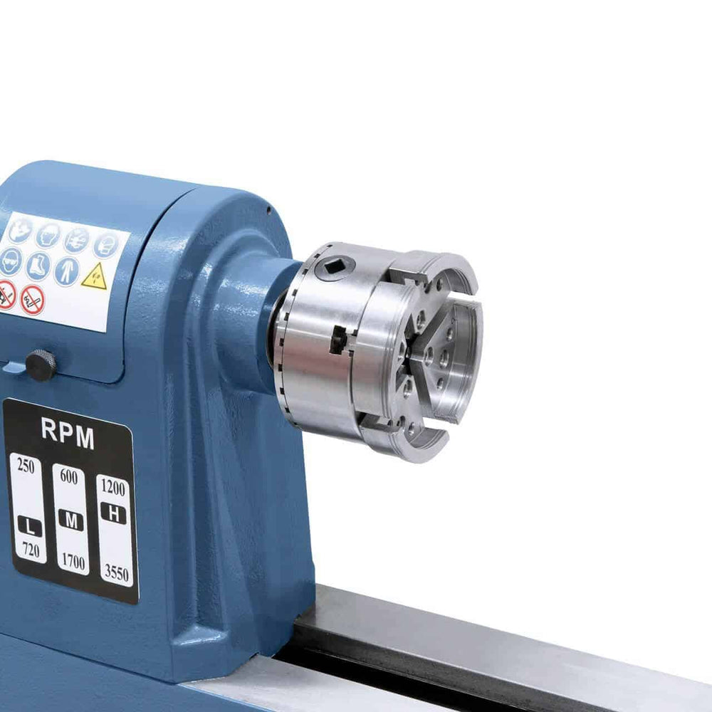 The VDM 500 lathe features continuous speed regulation via inverter, with three selectable ranges: low (250–720 rpm), medium (600–1700 rpm), high (1200–3550 rpm).