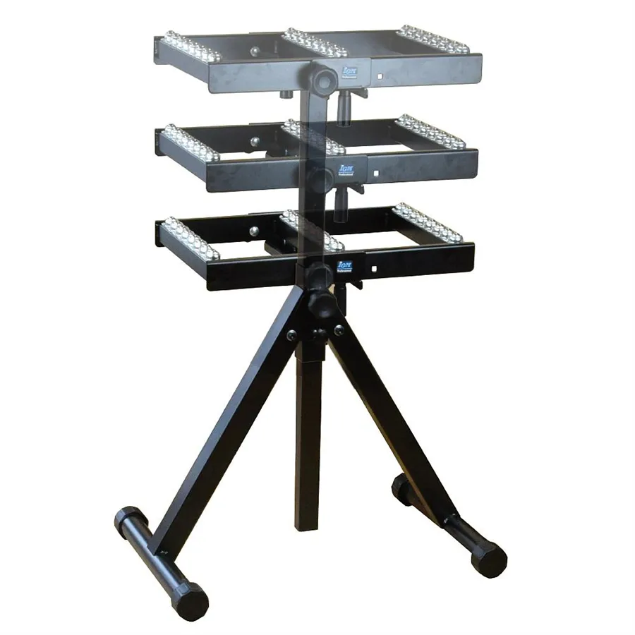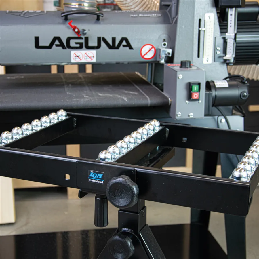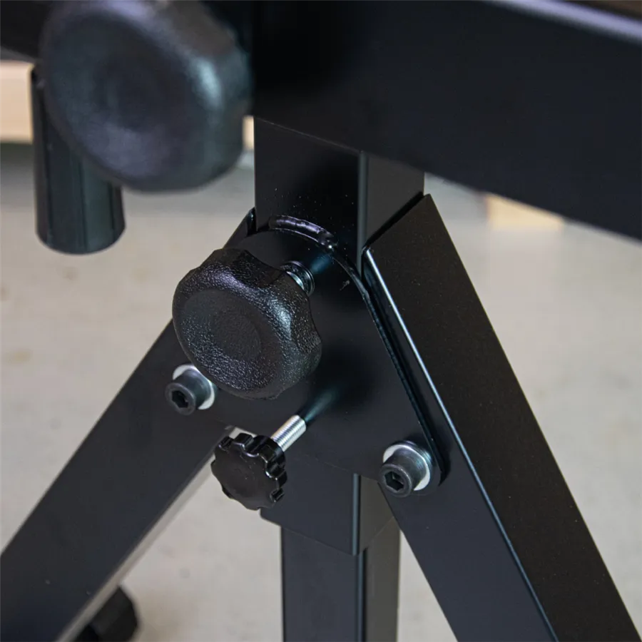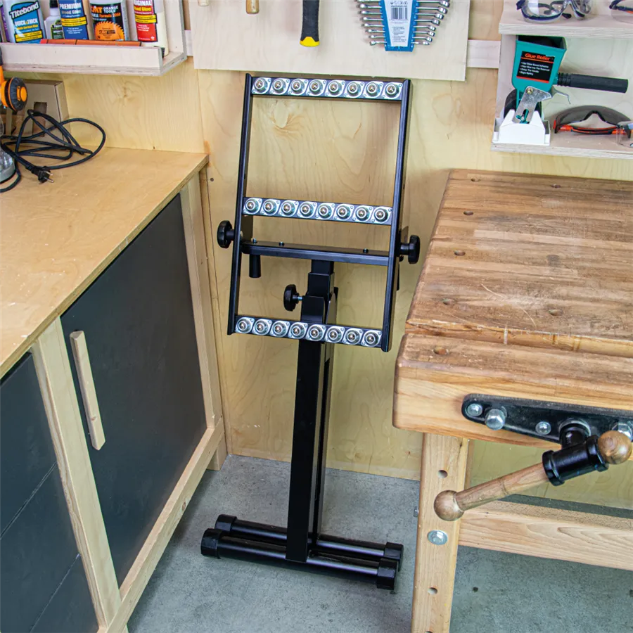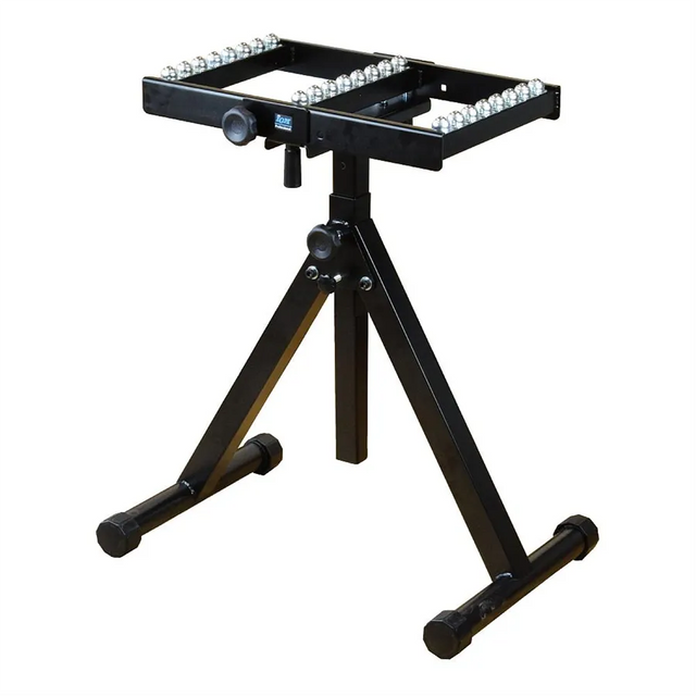 Il Supporto a Sfere Robusto è dotato di tre file di cuscinetti a sfera da 16 mm (8 per tre file), offrendo una superficie di appoggio di 350 × 560 mm. Questo stand è regolabile in altezza da 725 mm a 1140 mm e può essere bloccato in qualsiasi posizione mediante un sistema di bloccaggio a cuneo, garantendo impostazioni ferme e prive di scivolamenti. Costruito solidamente in profili d'acciaio, è capace di sostenere carichi fino a 200 kg. I piedi sono regolabili in altezza per eliminare qualsiasi squilibrio del pavimento e garantire stabilità in tutte le situazioni. Il supporto è completamente ripiegabile, consentendo un comodo stoccaggio o trasporto. Fornisce supporto a materiali di grandi dimensioni, rendendolo ideale per l'uso professionale e commerciale.